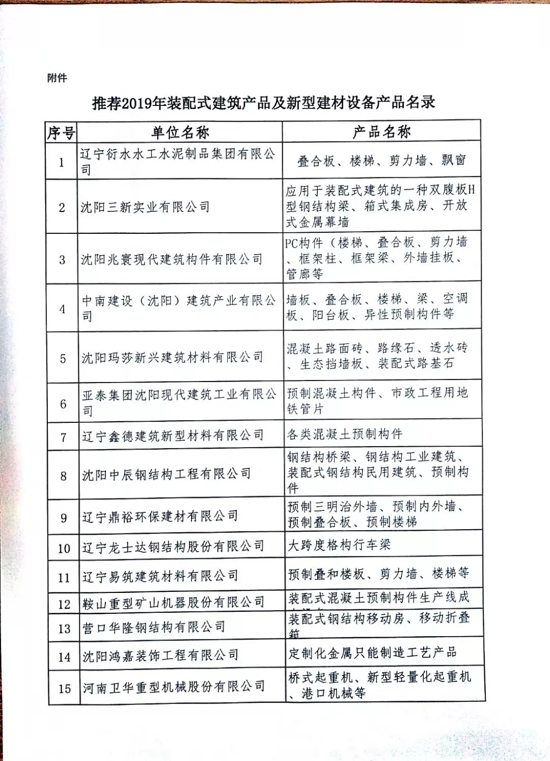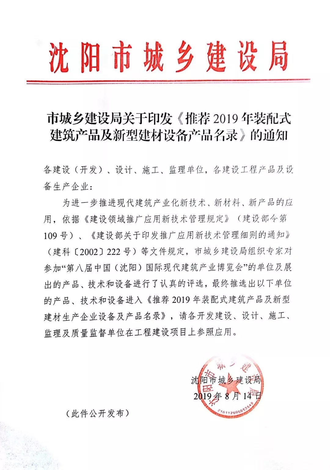 2019年8月,為了進一步推進現代建筑產業化新技術、新材料、新產品的應用,沈陽市城鄉建設局依據相關管理規定對參加“第八屆中國(沈陽)國際現代建筑產業博覽會”的單位及展出的產品、技術和設備進行了認真的評選,最終推選出《推薦2019年裝配式建筑產品及新型建材生產企業設備及產品名錄》企業。